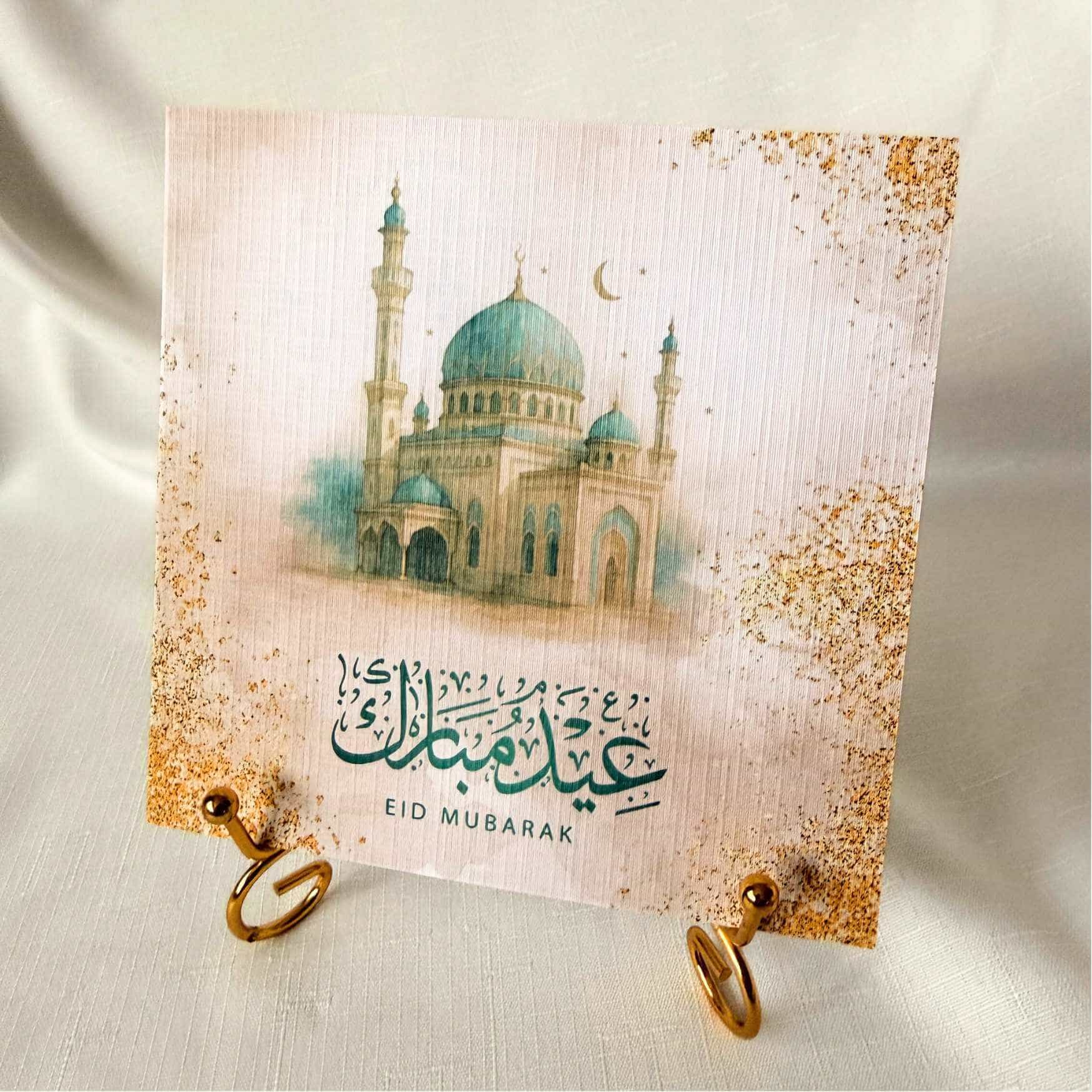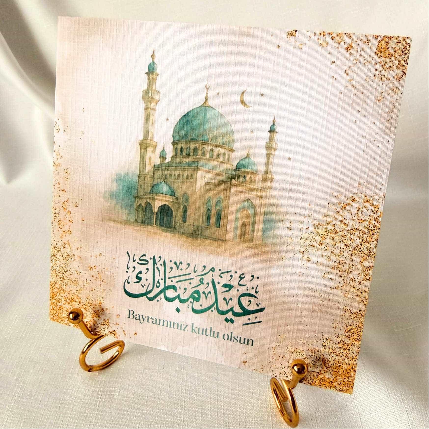 Darüber ist eine Moschee abgebildet. Moscheen sind im islamischen Kulturraum nicht nur Gebetsorte, sondern auch zentrale Treffpunkte der Gemeinschaft. Besonders an Festtagen kommen Familien und Gemeindemitglieder dort zusammen, um gemeinsam zu beten, sich zu begegnen und das Fest zu begehen. Die Moschee steht auf dieser Karte daher symbolisch für Gemeinschaft, Zusammenhalt und die Bedeutung des Festtages.